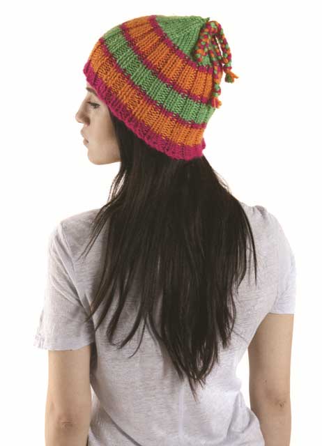 Using 4 stands of each colour (about 36 -in./1 m long). Make a knot at one end and braid. Knot the other end. Make a bow and secure to the top of the hat.